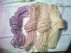 左から 酢入り、原液、重曹入り、染める前の毛糸