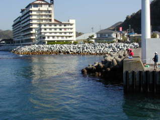 釣り場全景 解説 ホテル三日月の手前に伸びた白灯堤防で、