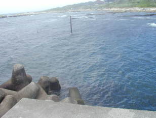 荒れた日は中央の突堤でも面白い釣りができる。堤防先端 このテトラ周りがここのポイント。