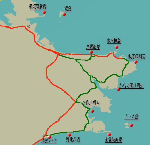 詳しい場所の検索は 横須賀周辺略図 ★横須賀新提 ★猿島 ★馬堀海岸 ★走水棒島 ★観音崎周辺 ★かもめ団地周辺 ★平作川河口 ★アシカ島 ★アシカ島(小) ★アシカ島(大) ★東電防波堤 ★野比周辺 ★長沢テトラ