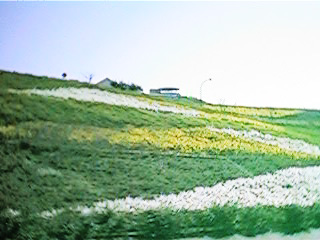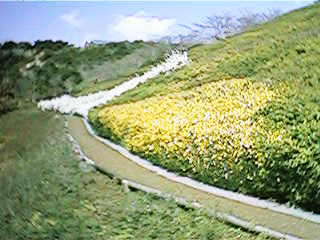 レンギョ(黄色い花)とユキヤナギ(白い花)の花が斜面いっぱいに咲いていてキレイでした。
