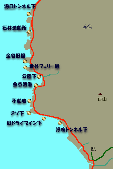 詳しい場所の検索は 金谷周辺略図 ★洞口トンネル下 ★石井造船所 ★金谷旧堤 ★金谷フェリー港 ★公園下 ★金谷漁港 ★不動岩 ★アソ下 ★旧ドライブイン下 ★汐吹トンネル下 ---------------- ★金谷沖磯群